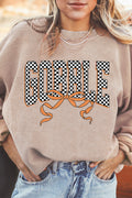 Apricot Twisted Ribbed Texture Checkered GOBBLE Bow Heat Transfer Printing Sweatshirt