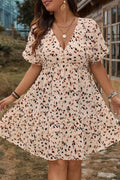 Beige Abstract Print Surplice V Neck Cuffed Sleeve Empire Waist Plus Size Dress
