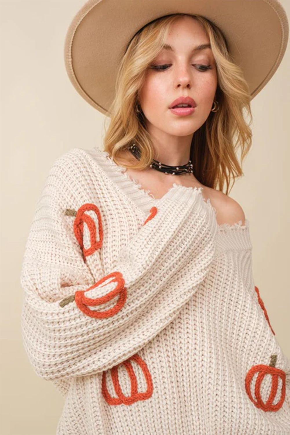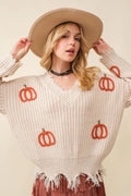 Beige Pumpkin V Neck Distressed Edge Knit Sweater