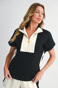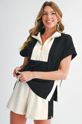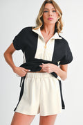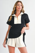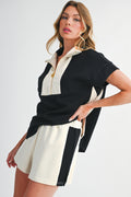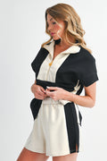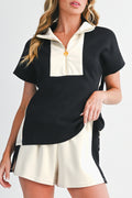 Black Colorblock Zipper Collar T Shirt and Shorts Set
