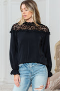 Black Leopard Sheer Splicing Lace Neck Ruffle Blouse