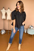 Black Solid Color Puff Sleeve Stylish Collared Shirt