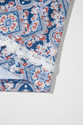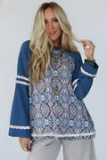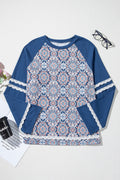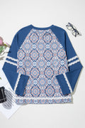Blue Boho Geometric Print Lace Ricrac Raglan Sleeve Blouse
