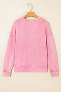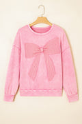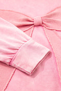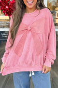 Bright Pink Mineral Wash Waffle Bow Patched Pullover Sweatshirt