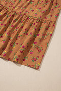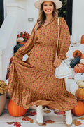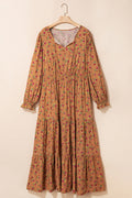 Brown Plus Size Floral Split V Neck Ruffled Sleeve Tiered Maxi Dress