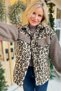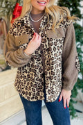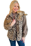 Brown Sherpa Leopard Print Flap Pocket Collared Button Up Jacket