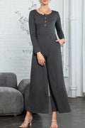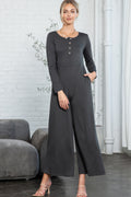 Dark Grey Henley Long Sleeve Wide Leg Jumpsuit with Pockets