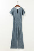 Dusk Blue Ribbed Keyhole Short Sleeve Wide Leg Jumpsuit