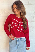 Fiery Red Contrast Trim Big Bow Accent Cropped Sweater