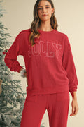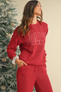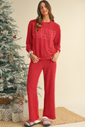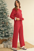 Fiery Red Crinkle Rib JOLLY Pattern Long Sleeve Top and Pockets Pants Set