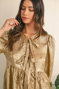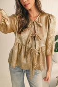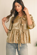 - Add elegance to your wardrobe with this gold bowknot front puff sleeve blouse.