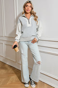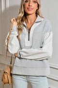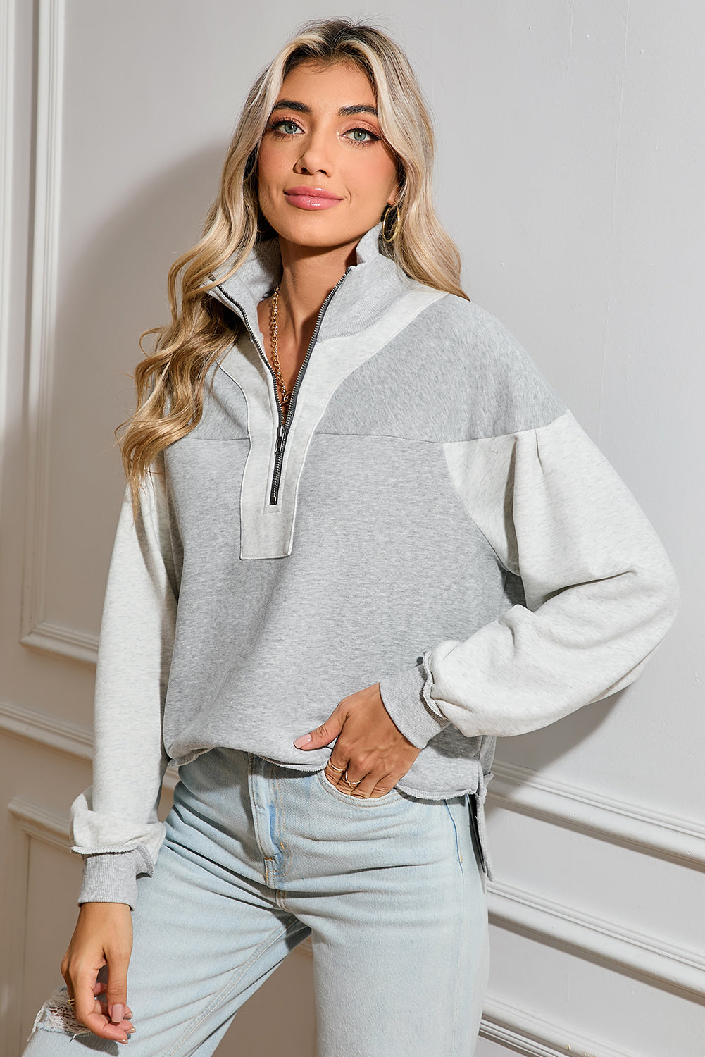 Gray Zip Collar Colorblock Side Slits Sweatshirt