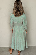 Green Striped V Neck Zip Front Cinched High Waist Midi Dress