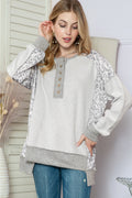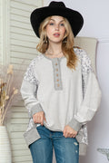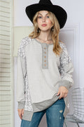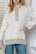 Grey Leopard Print Raglan Sleeve Casual Henley Sweatshirt