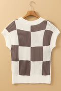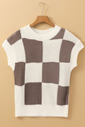 Khaki Checkered Color Block Crew Neck Short Sleeve Sweater