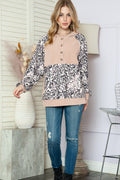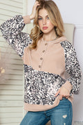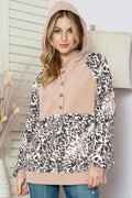 Leopard Print Raglan Sleeve Henley Pullover Hoodie