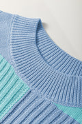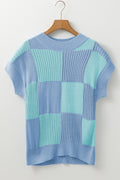 Light Blue Checkered Color Block Crew Neck Short Sleeve Sweater