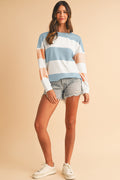 • Embrace a relaxed vibe with our top, blending a serene sky-blue hue with trendy striped colorblocking for a chic yet laid-back look.