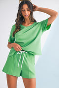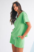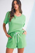 Mint Green V Neck Drop Shoulder Tee and Patchwork Shorts Set