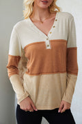 - Featuring a unique color block and stripe combination, this top adds a modern twist to a classic Henley style.