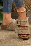 Pale Khaki Double Buckle Straps Frayed Detial Retro Slippers
