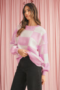 Pink Checked Bishop Sleeve Pullover Sweater