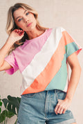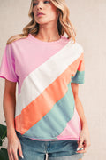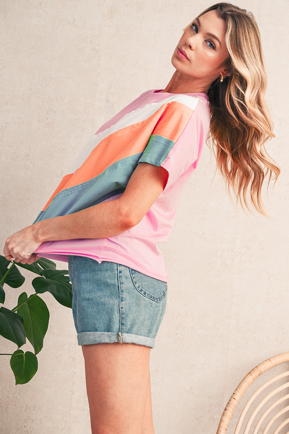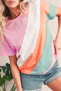 Pink Color Block Patchwork Seamed Crewneck T Shirt