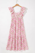 Pink Floral Print Square Neck Ruffled Strap Maxi Dress