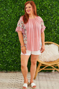 Pink Plus Size Floral Patchwork Ruffle Short Sleeve Blouse