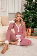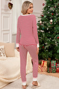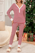 Red Stripe Buttoned V Neck Top and Knotted Waist Pants Pajama Set