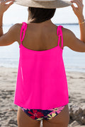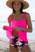 Rose Red Solid Color Cami and Floral Print Panty Tankini Set