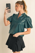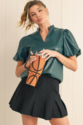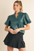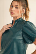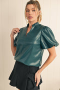 Sea Green Solid Color V-Neck Puff Sleeve Blouse