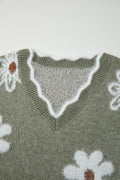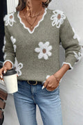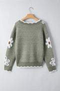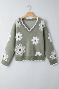 Seagrass Jacquard Floral Scallop V-neck Sweater