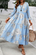 Sky Blue Floral Bell Sleeve V Neck Plus Size Tiered Maxi Dress