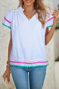 Sky Blue Striped Ricrac Splicing Frill V-Neck Blouse