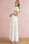 White Frill Neckline Shirred Bodice Floral Maxi Dress